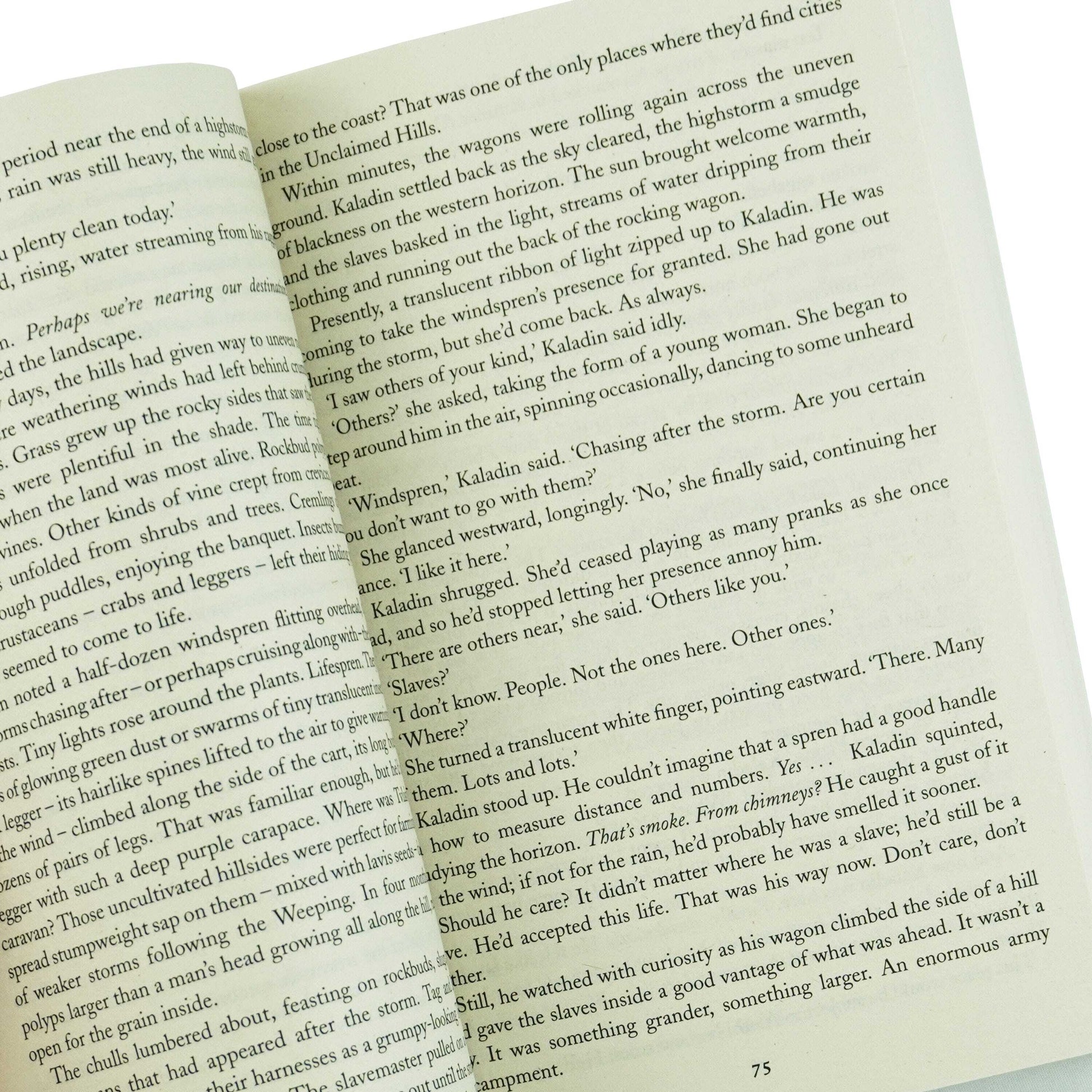Kaladin, who traded his medical apprenticeship for a spear to protect his little brother, has been reduced to slavery. In a war that makes no sense, where ten armies fight a single foe, he struggles to save his men and to fathom the leaders who consider them expendable.